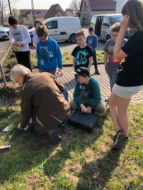 Ende März 2022 brachten wir die Nistkästen mithilfe von Herrn Engelmann von der Jägerschaft Sangerhausen e.V. in und um Riestedt an.
