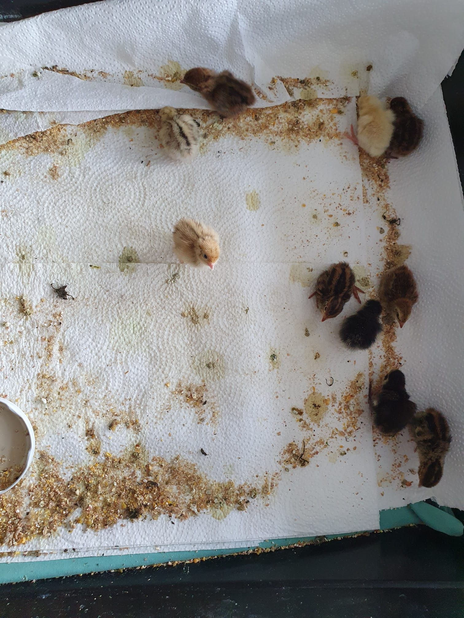 Aber nicht allen ging es gut. zwei unserer Wachtelküken waren sehr schwach und nicht stark genug zum Laufen, deswegen wurden sie von ihren Geschwistern angepickt.