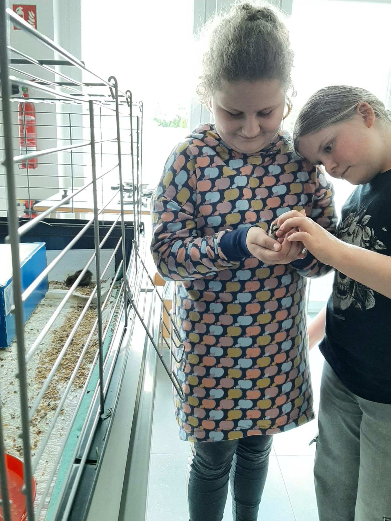 Maximilian, Luise und Jasmin haben die zwei kleinen Wachteln in einen Karton gesetzt und gepflegt. Sie haben von uns Futter und Wasser bekommen.
